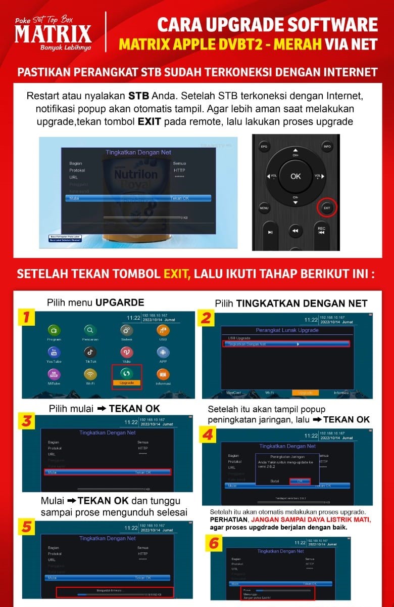 • Mulai Proses Update: Ikuti instruksi yang muncul di layar TV untuk memulai proses update firmware. Penting: Jangan matikan STB selama proses update berlangsung.